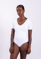 Made of super-soft, double-lined organic cotton, the Short Sleeve V-Neck Bodysuit features a deep plunge V for a figure-defining shape.