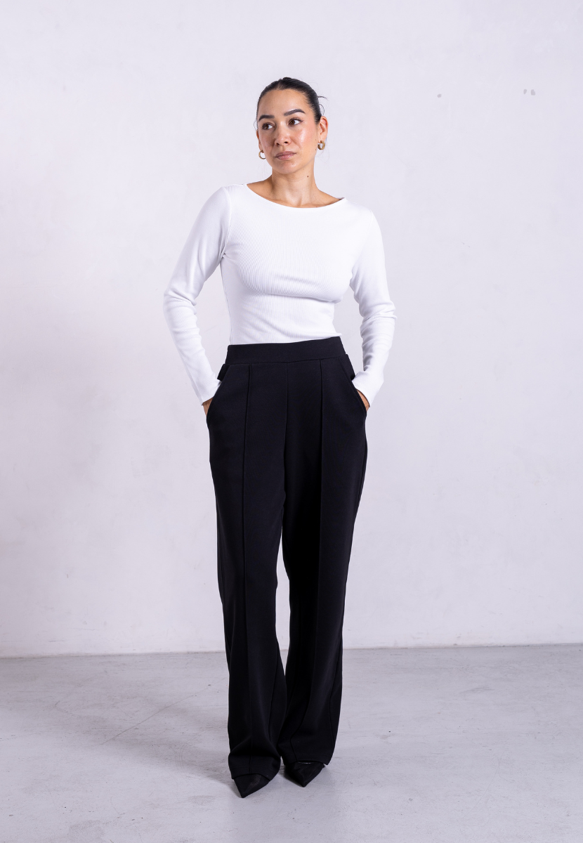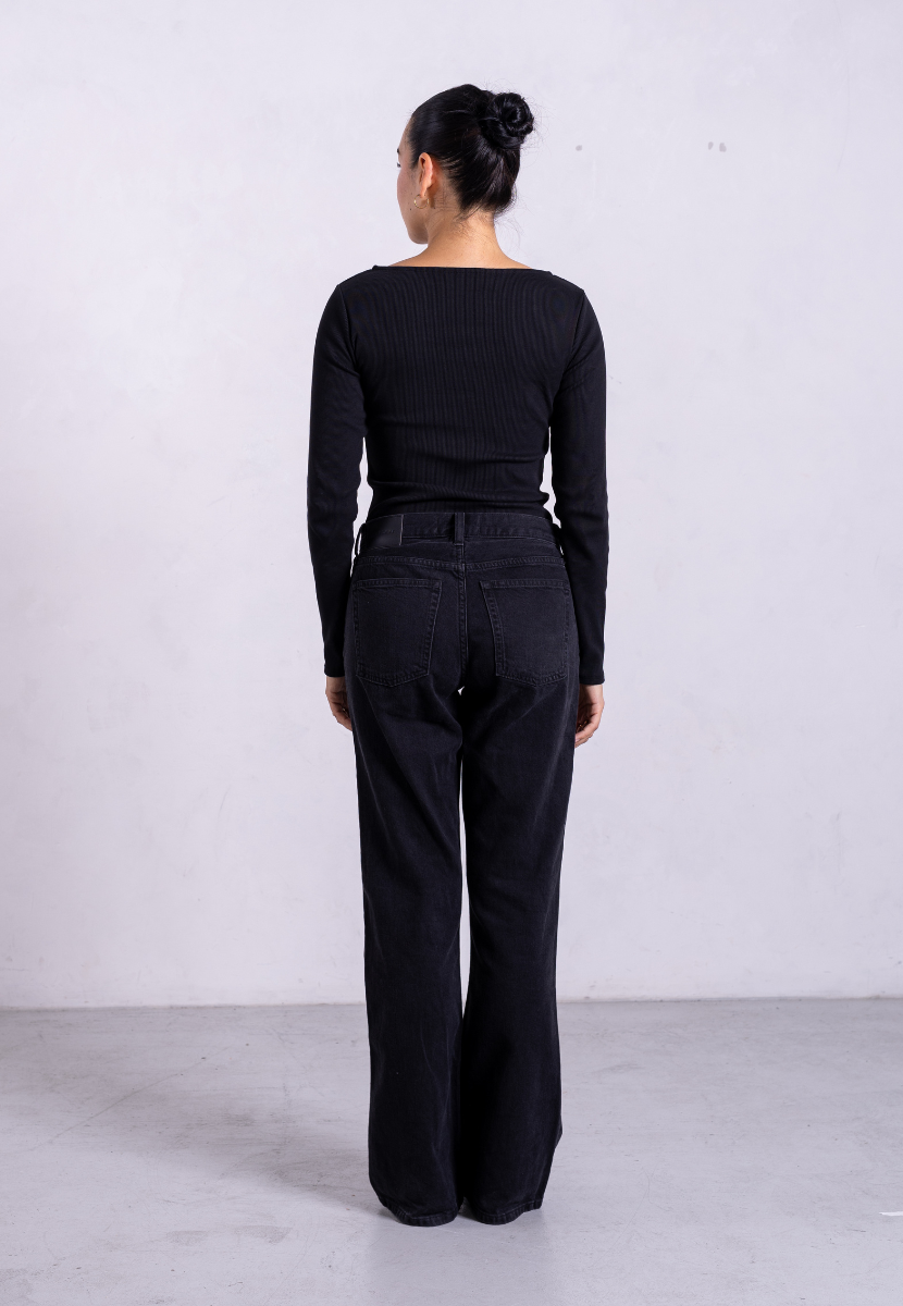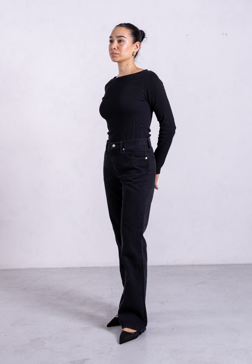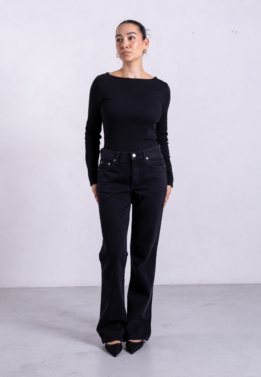 Ribbed Boat Neck Long Sleeve T-Shirt, Black
