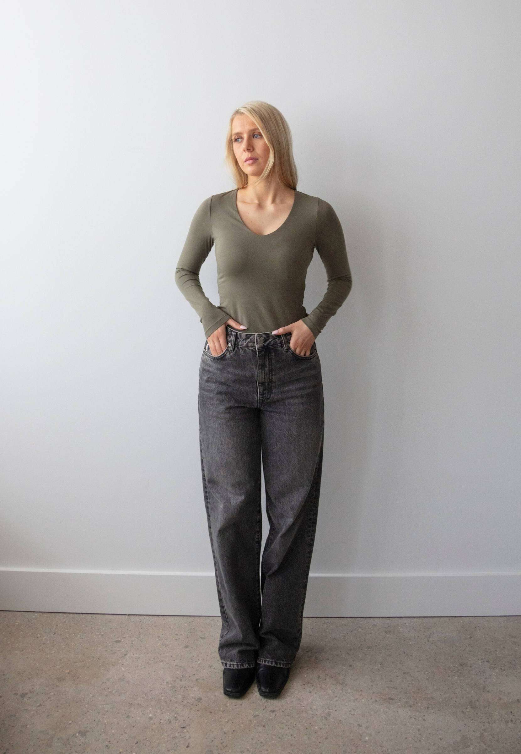 Organic Cotton V-Neck Long Sleeve T-Shirt, Charcoal