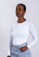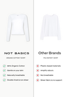 Your skin's new best friend: for those who care what touches their skin all day. Thoughtfully designed to be the best t-shirt you own, this form-fitting, ultra-flattering white long-sleeve t-shirt is perfect for everyday all-day wear. Made from double-lined certified Organic Cotton, undeniably comfortable, and visibly exceptional.